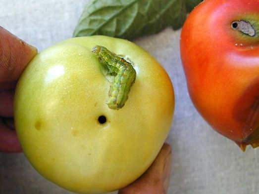 spray Indoxacarb 14.5 SC (1.0 ml/l) or Thiodicarb 75WP (1.0 g/l) or Enamectin benzoate 5% SG (0.4 g/l) or any other effective insecticide or botanicals or bio-pesticide registered for tomato fruit borer with Central Insecticide Board.